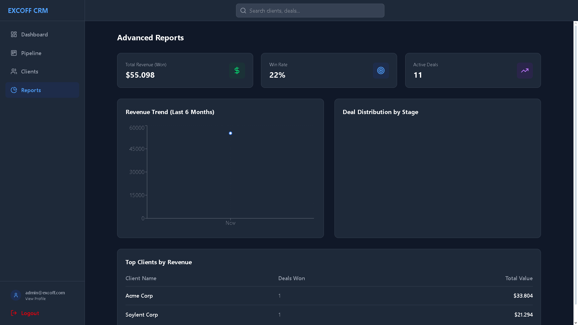 Desarrollo de EXCOFF CRM, una plataforma web centralizada que automatiza la entrada de datos y ofrece visualización en tiempo real mediante WebSockets. Sistema CRM compatible con PC y dispositivos móviles.
